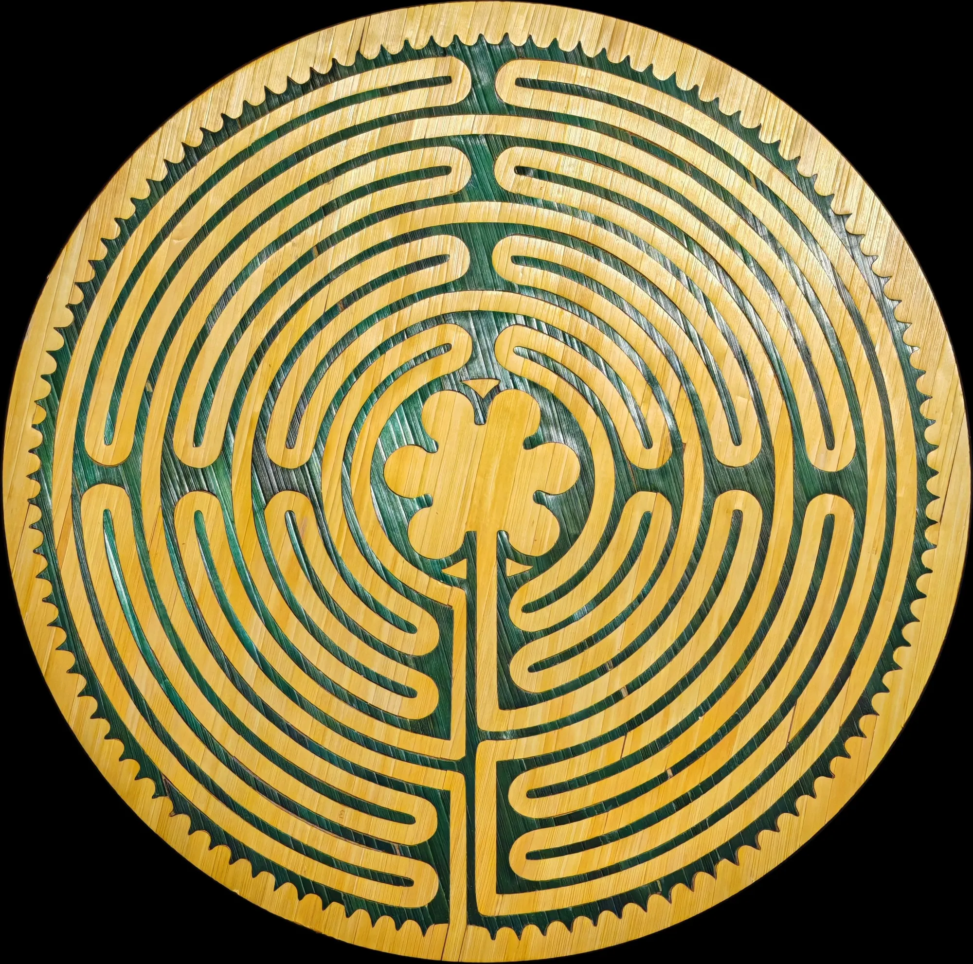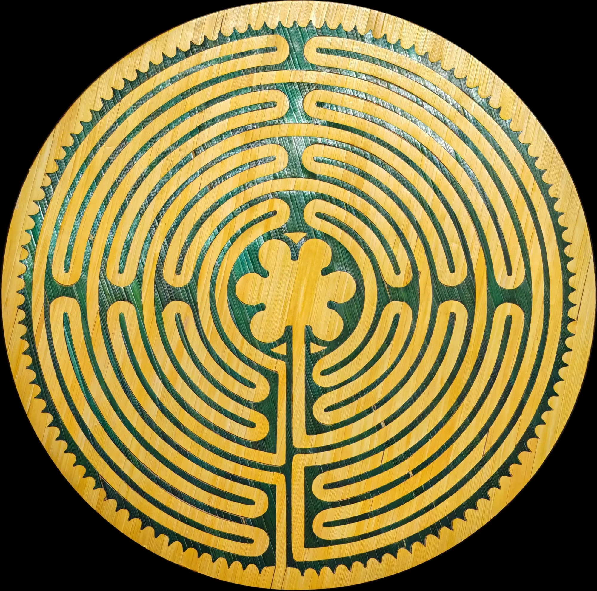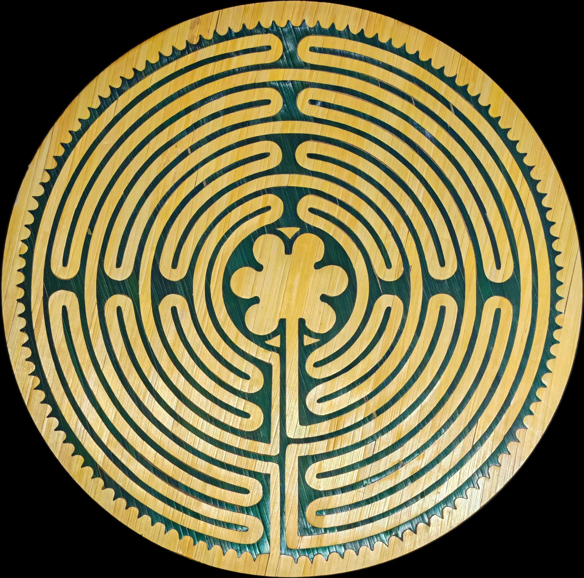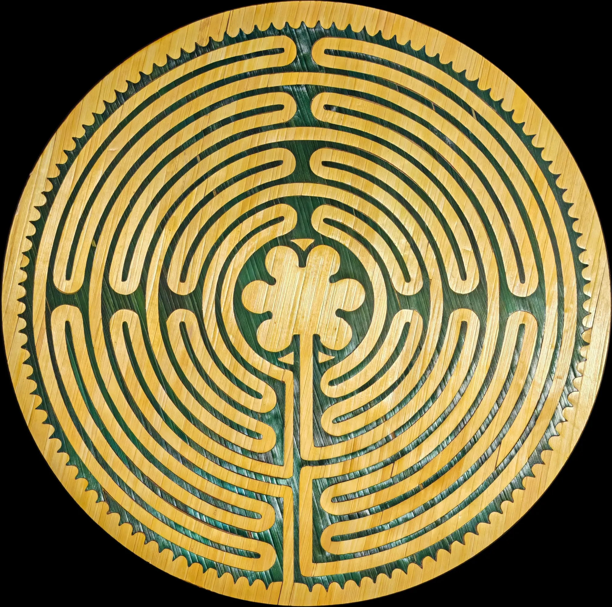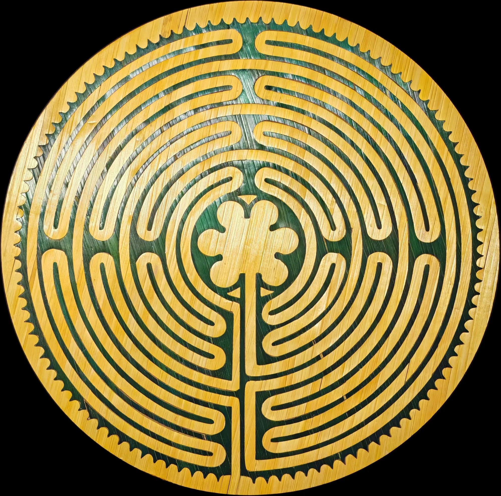 Le dessin s’inspire directement du labyrinthe inscrit dans le sol de la cathédrale de Chartres, œuvre médiévale à la fois architecturale et spirituelle.Retravaillé ici en marqueterie de paille, le tracé conserve son caractère de chemin unique, fait de détours, de retours et d’avancée continue.C’est une figure de la quête, traduite dans la matière et la lumière.