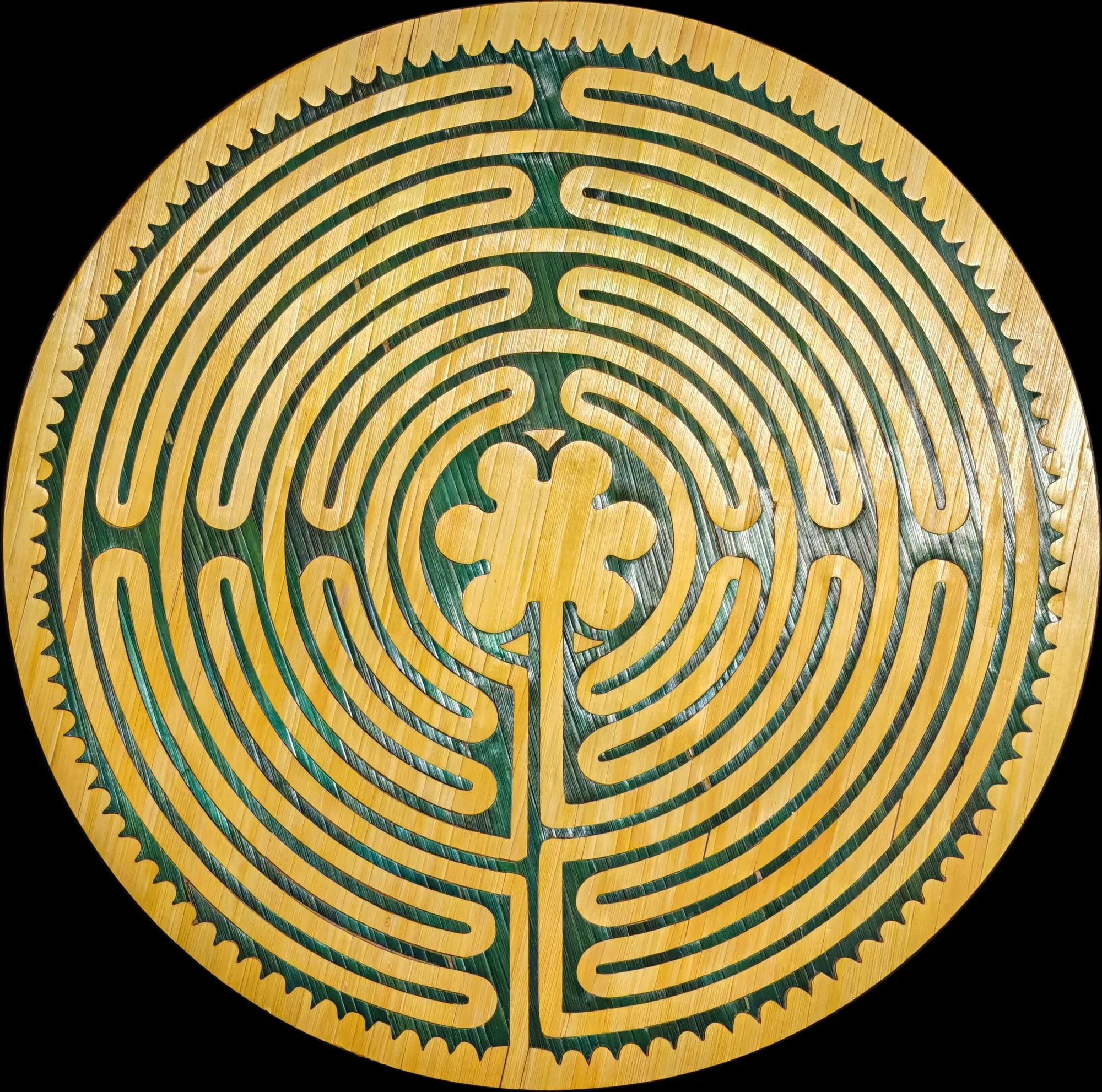 Le dessin s’inspire directement du labyrinthe inscrit dans le sol de la cathédrale de Chartres, œuvre médiévale à la fois architecturale et spirituelle.Retravaillé ici en marqueterie de paille, le tracé conserve son caractère de chemin unique, fait de détours, de retours et d’avancée continue.C’est une figure de la quête, traduite dans la matière et la lumière.