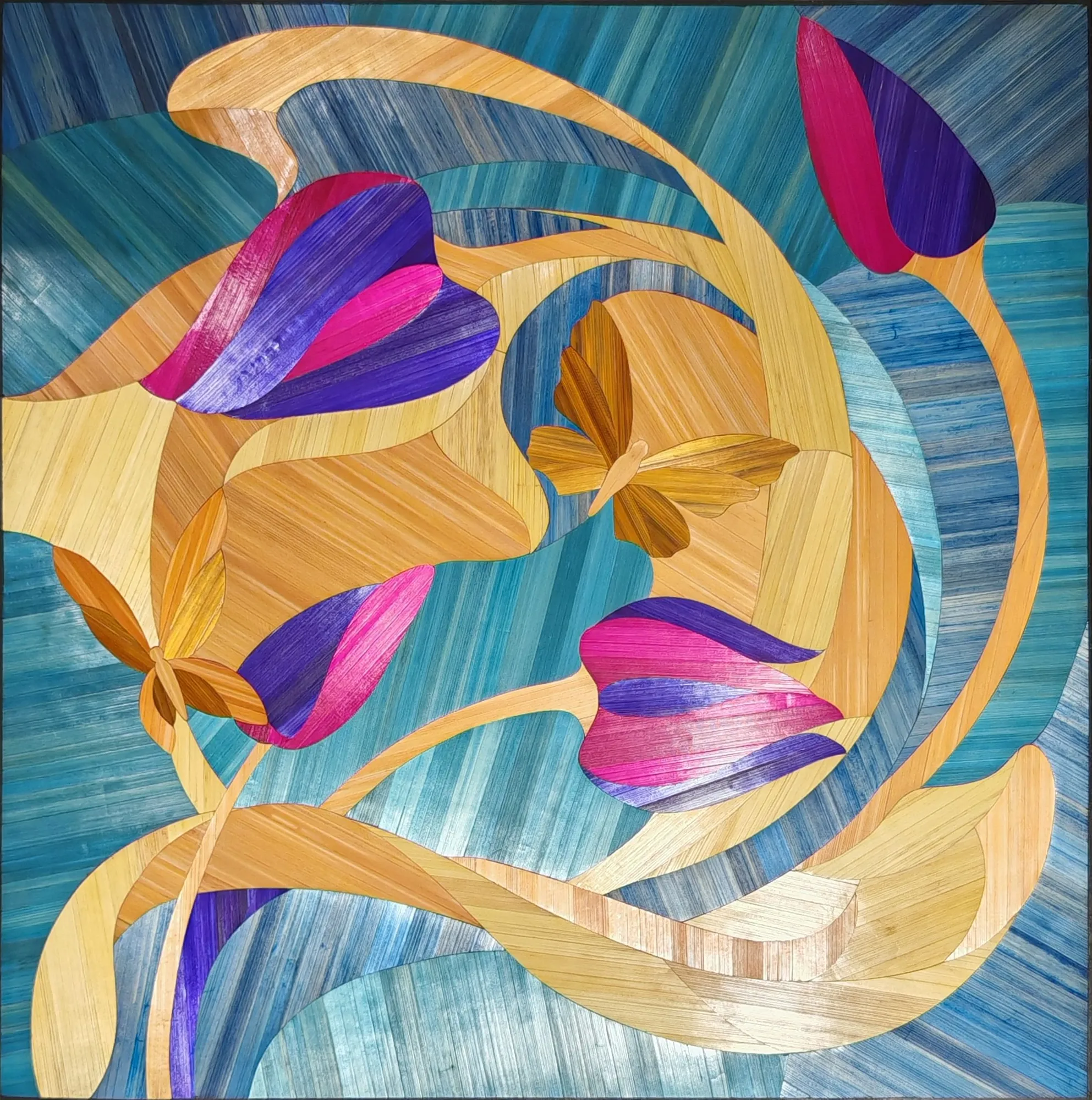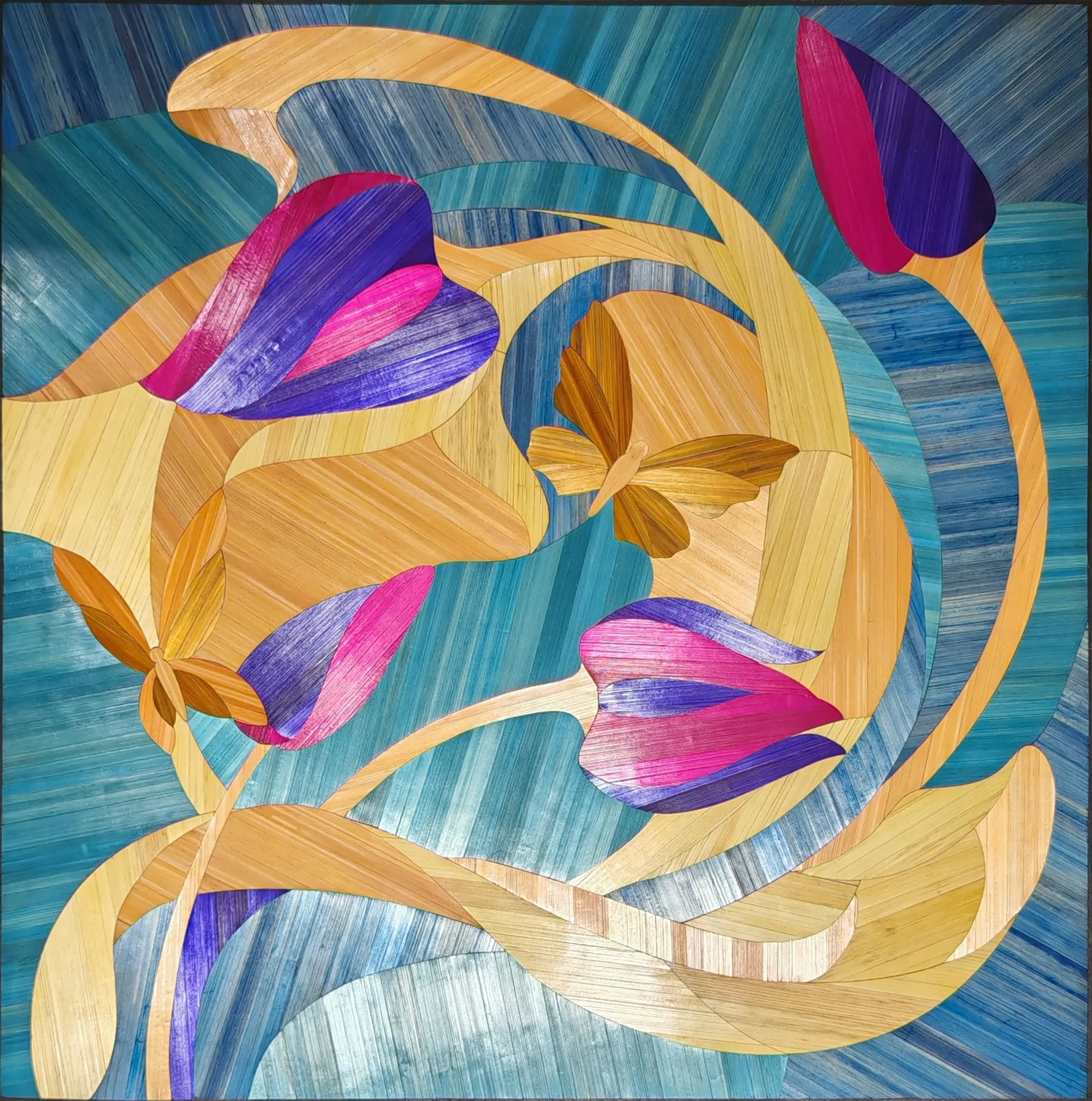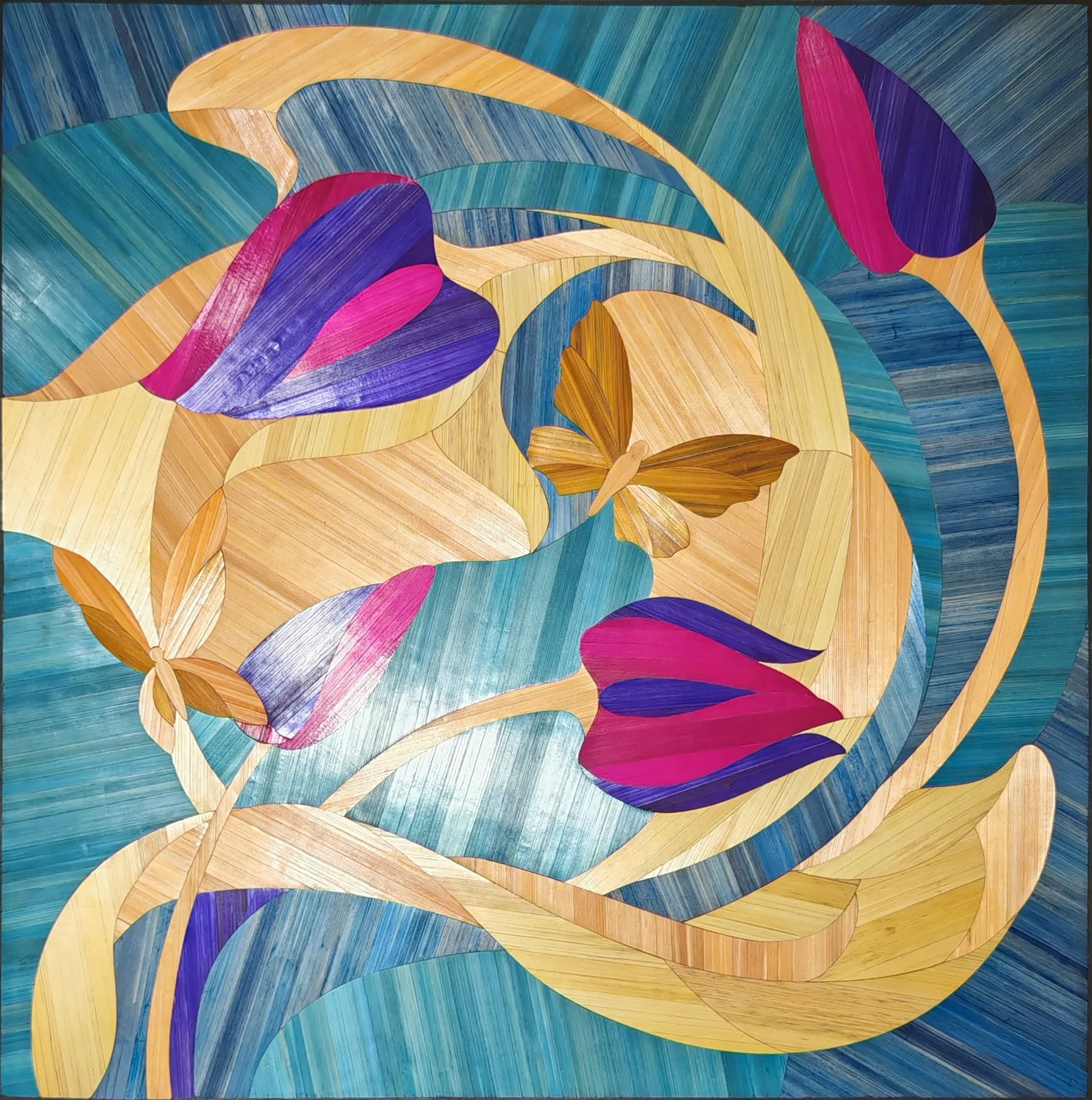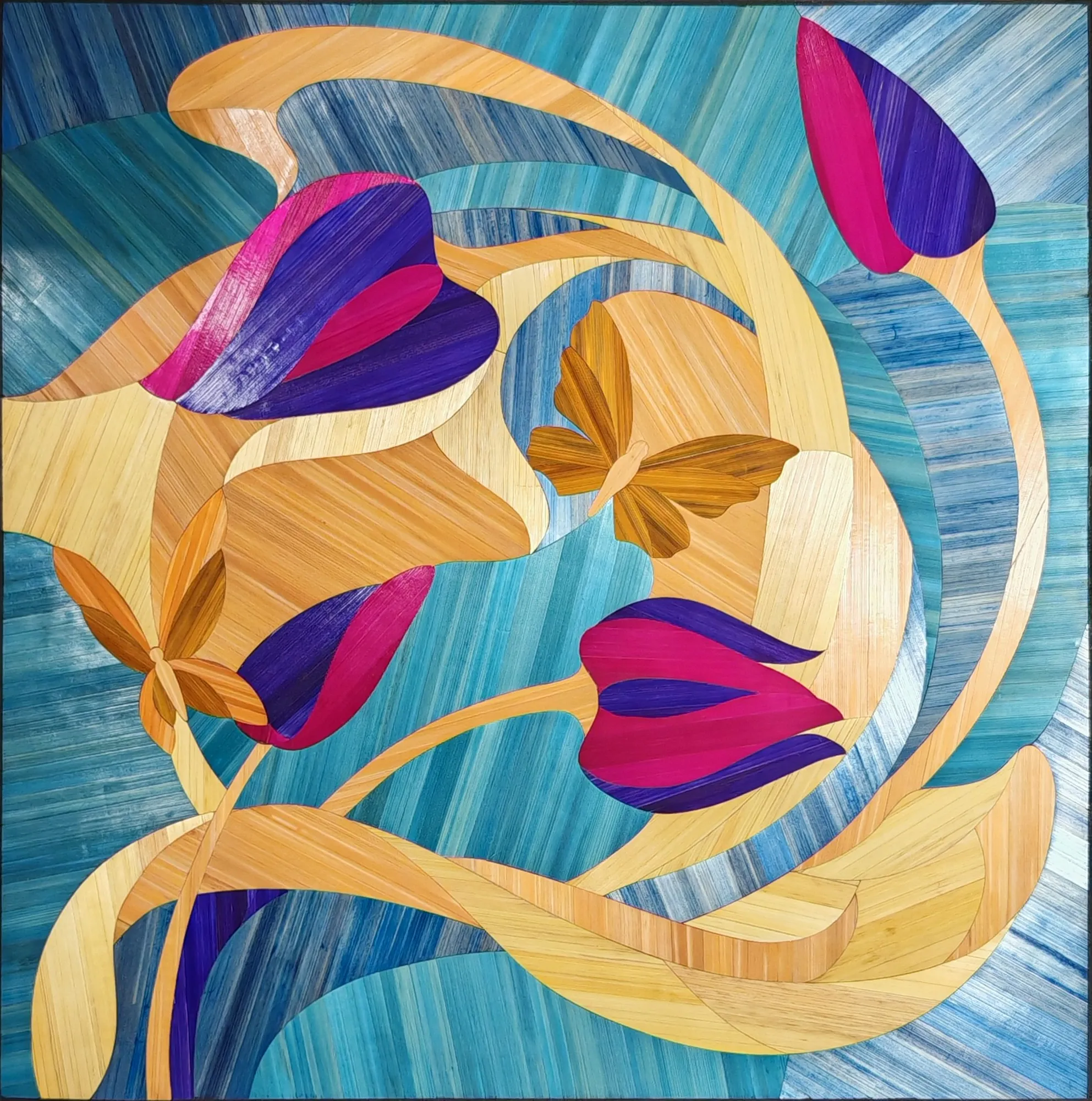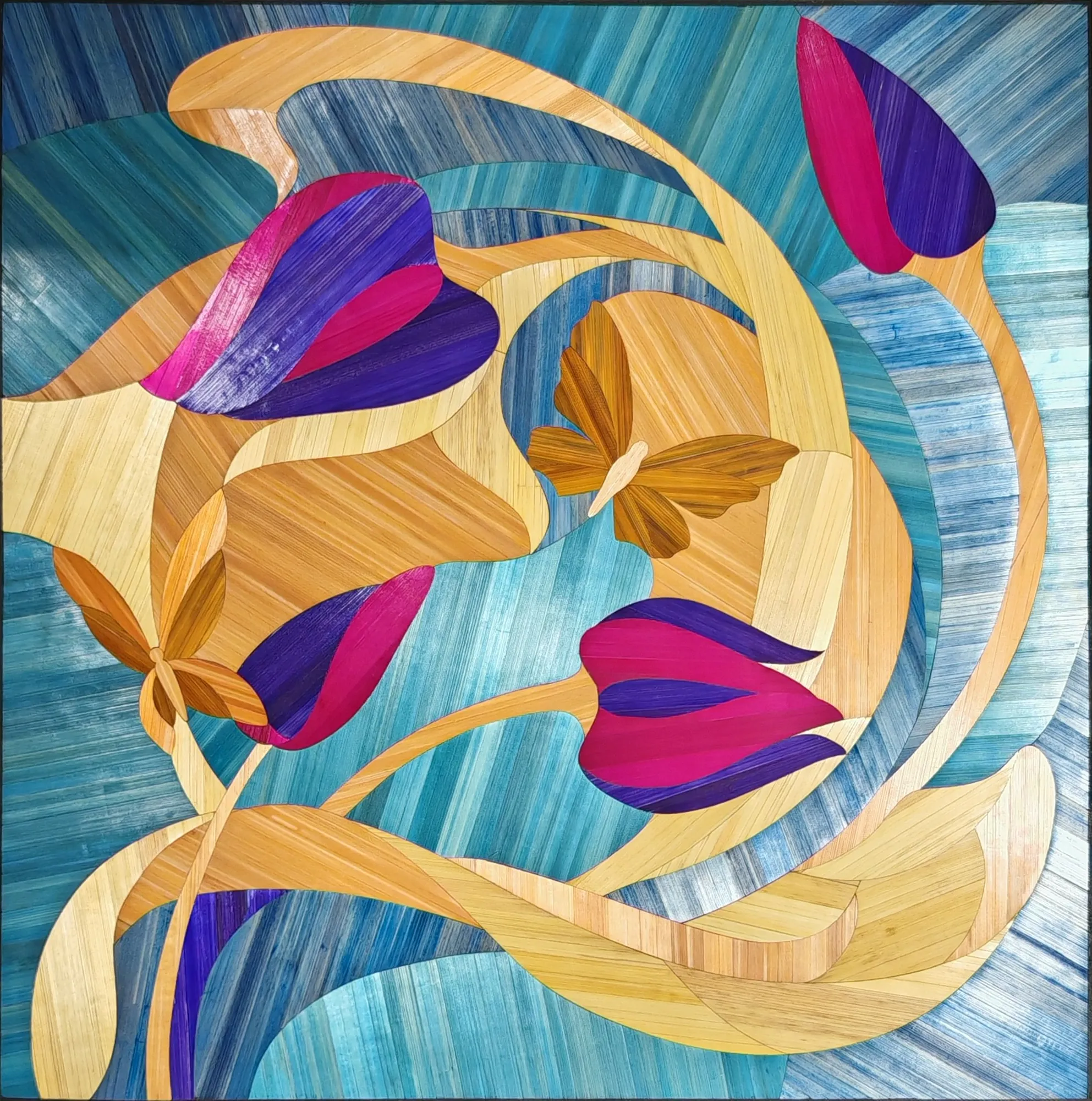 Ce tableau représente une tulipe stylisée aux lignes souples, travaillée en courbes sur un fond géométrique.Le contraste entre les surfaces met en valeur la forme du motif.L’ensemble repose sur un équilibre entre tension graphique et fluidité de la composition.