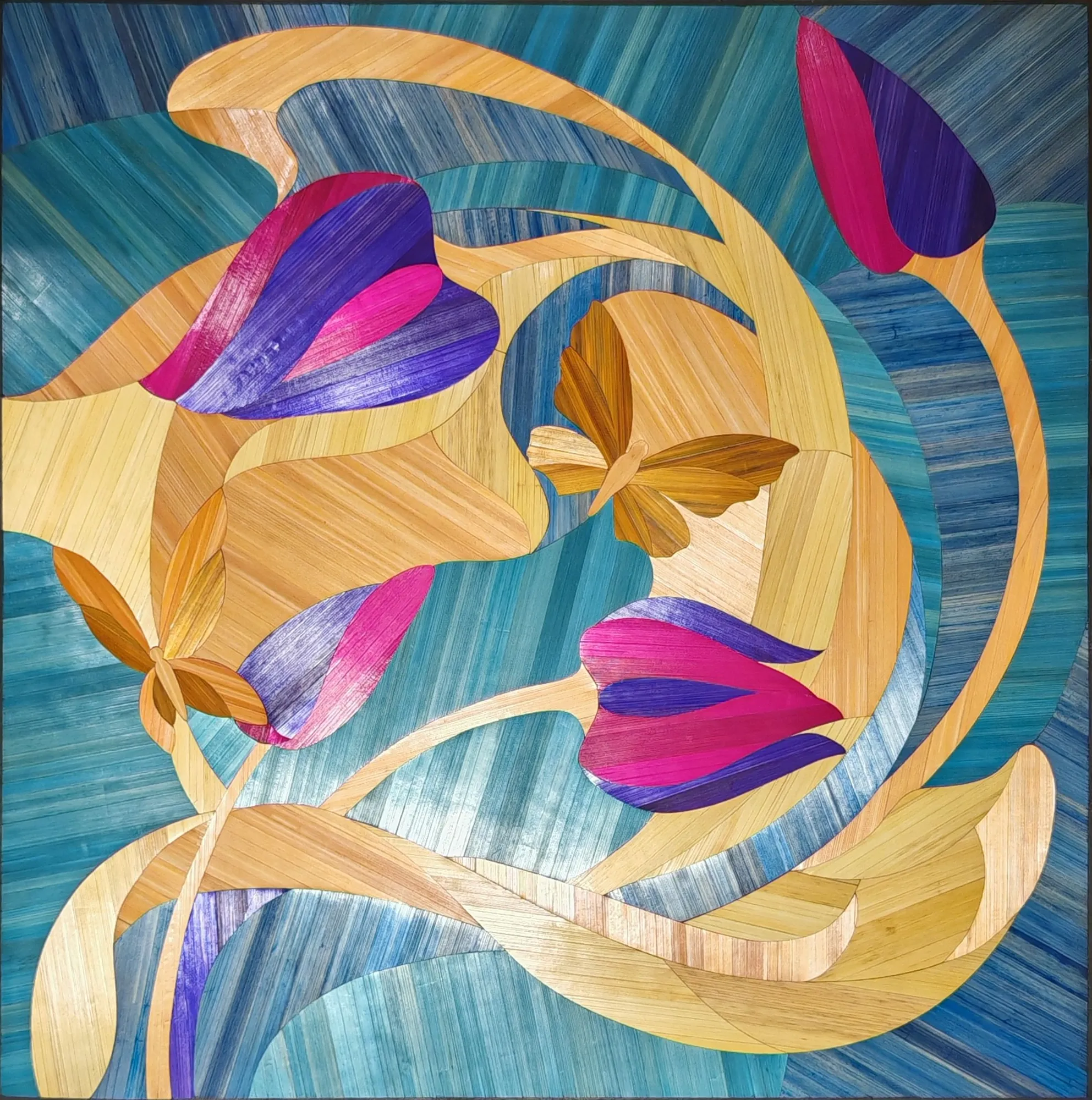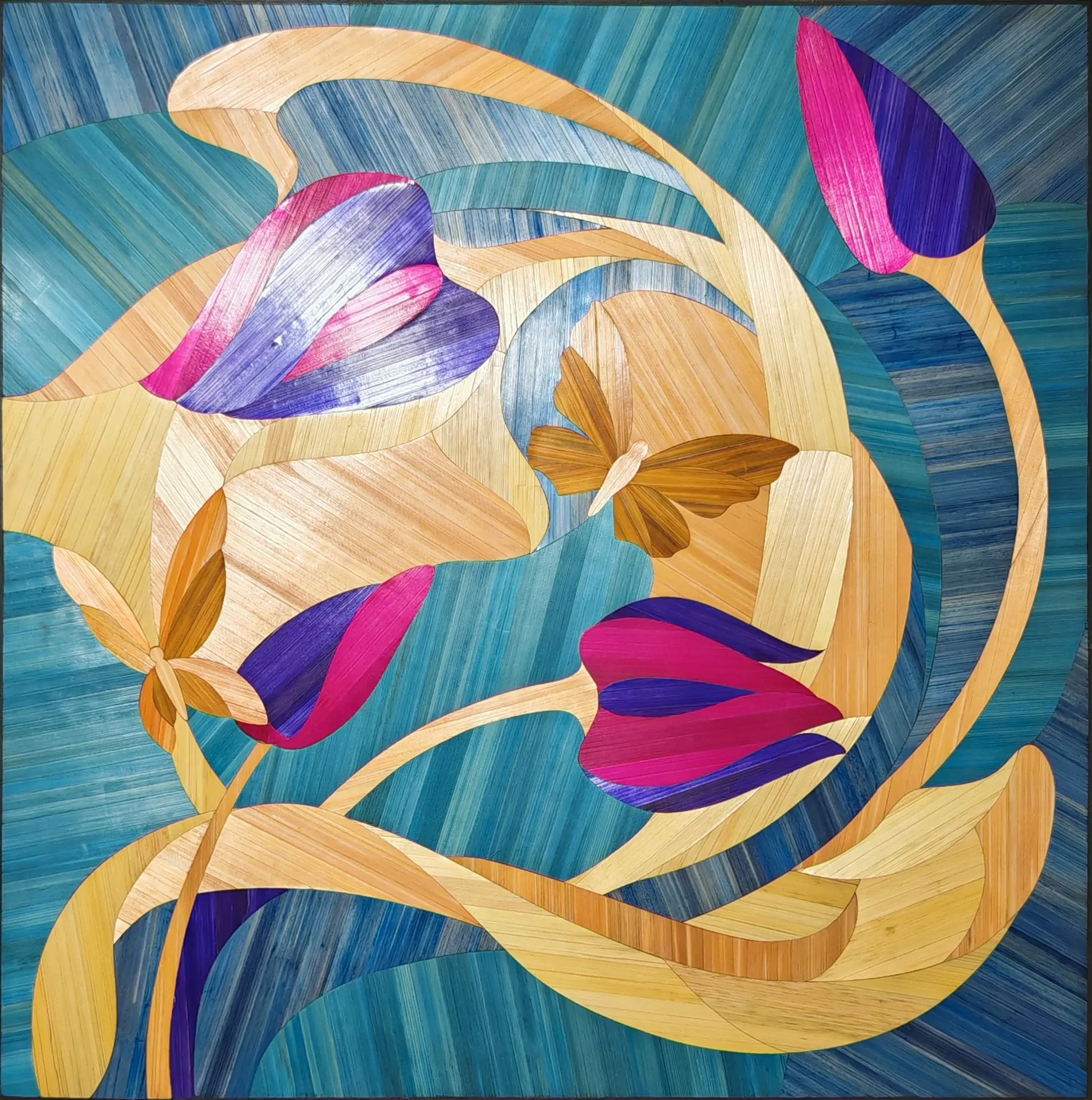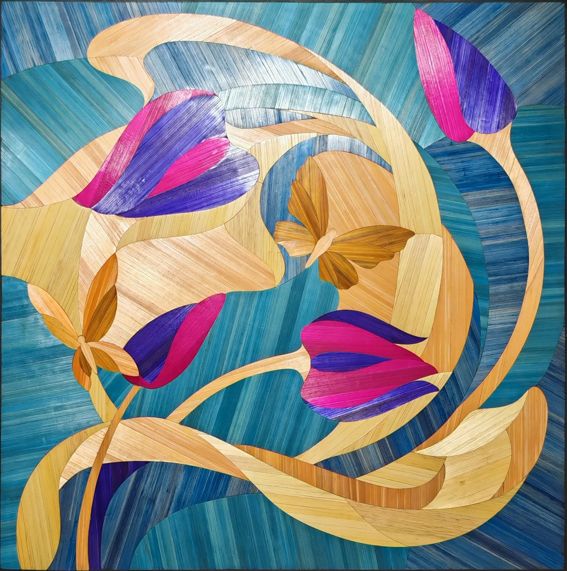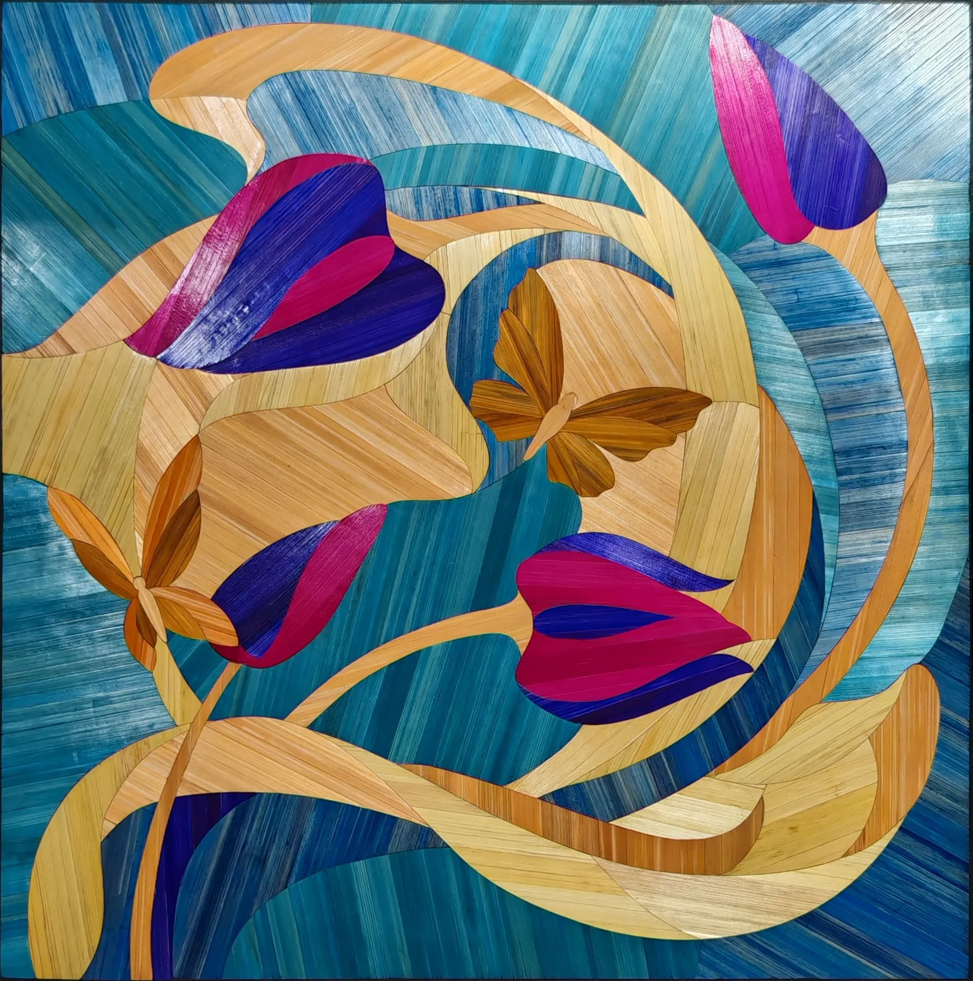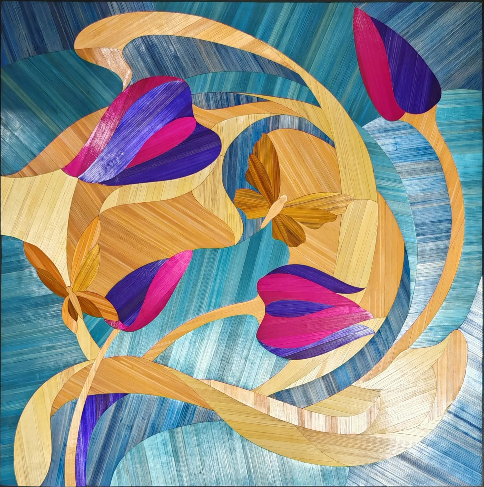 Ce tableau représente une tulipe stylisée aux lignes souples, travaillée en courbes sur un fond géométrique.Le contraste entre les surfaces met en valeur la forme du motif.L’ensemble repose sur un équilibre entre tension graphique et fluidité de la composition.
